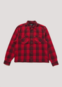 The Durango Cropped Overshirt is a red and black plaid overshirt, crafted from heavy woven cotton for a durable, textured feel. It features a button-front fastening and two front pockets, each with check flag detailing for a unique touch. The cropped style is perfect for layering or as a standout piece.