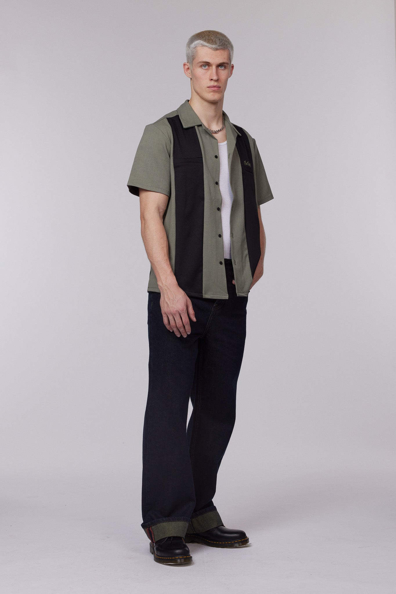 The Clayton Shirt is a classic Cuban-style shirt in solid green, with black contrasting panels running down the chest. Featuring a Revere collar and button-down front. The slightly oversized fit makes this men's shirt a great smart-casual piece: style it smart buttoned up with our slim cut jeans. For a relaxed look, layer over a plain tee and our workwear pants.