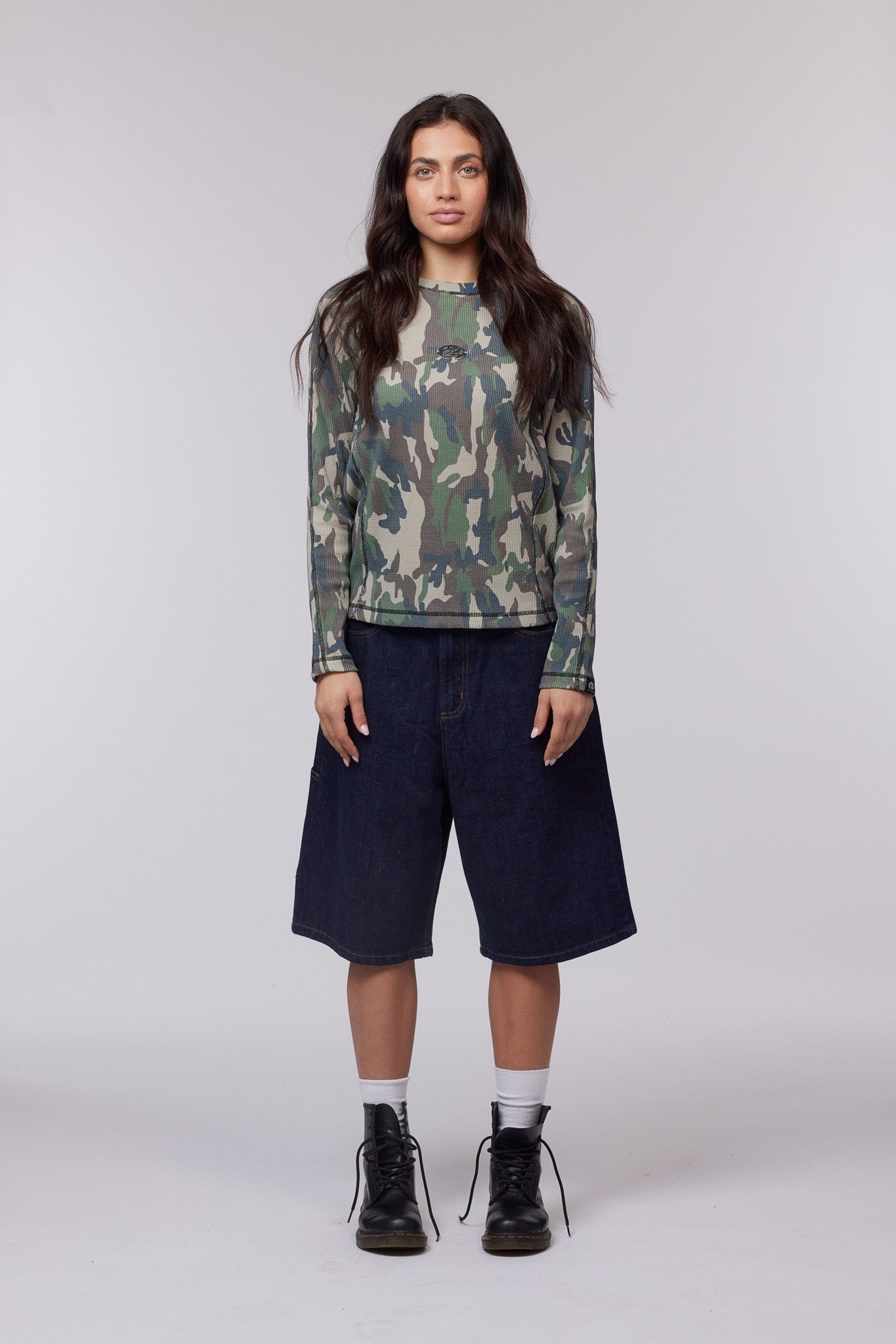 The Trek Waffle Top is a long-sleeve, waffle jersey camouflage top, featuring silver cybersigilism hardware on the chest. The top is detailed with contrast stitching, adding a stylish touch to the casual look. Perfect for everyday wear with a bit of edge.